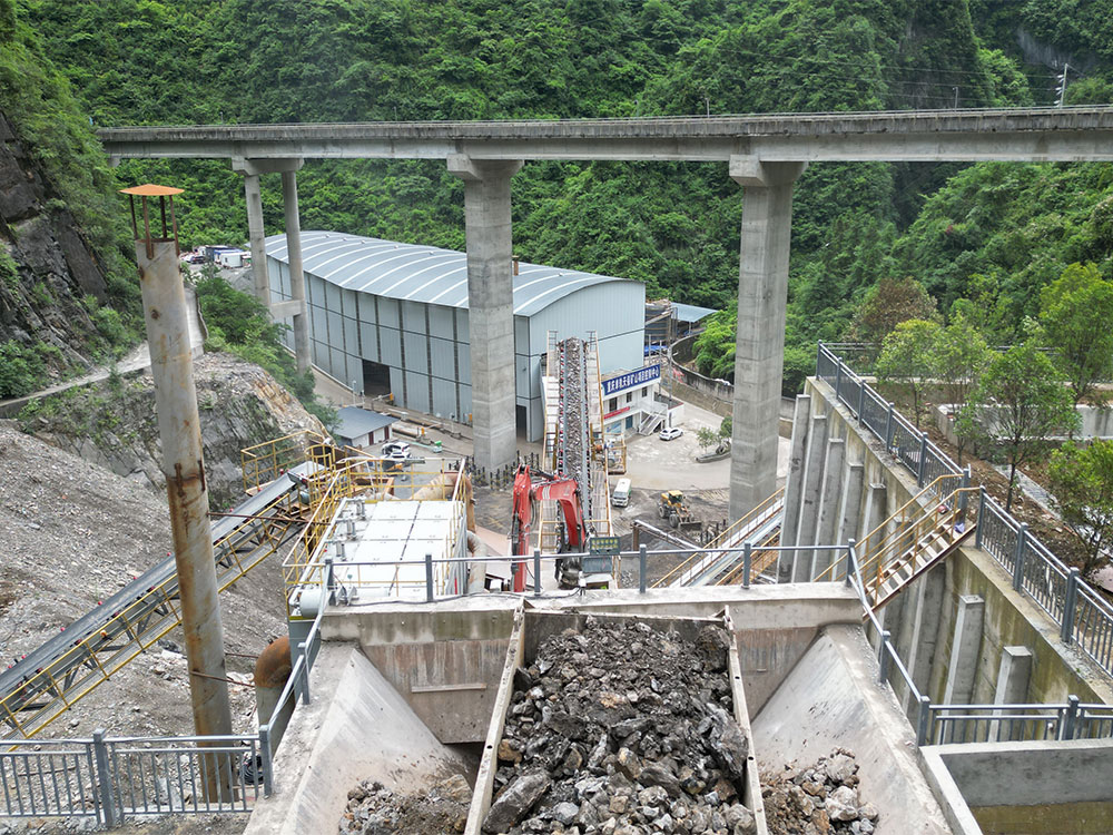 Bijih memasuki silo, dimasukkan ke penghancur rahang oleh pengumpan untuk diproses menjadi batu di bawah 60 cm, lalu dikirim ke penghancur sedang oleh konveyor untuk diproses menjadi batu 5-60 mm, dan saringan getar digunakan untuk memilih produk jadi. Beberapa jalur dilengkapi dengan saringan getar untuk memeriksa ukuran batu guna mencegah penyumbatan.