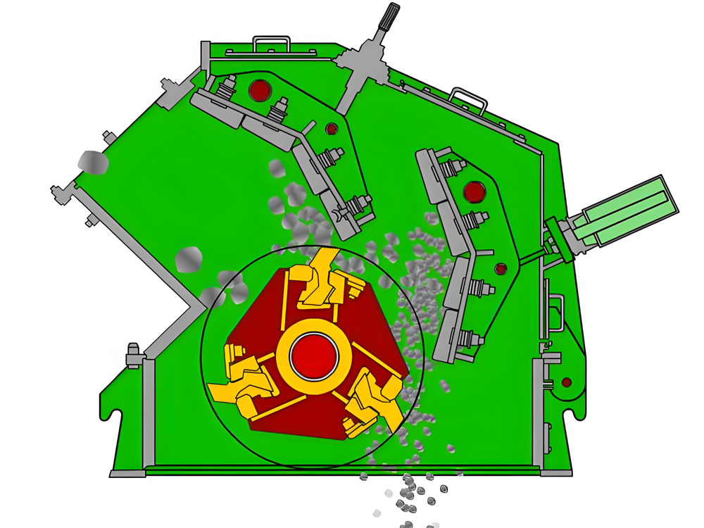 Setelah memasuki ruang penghancur dari port pengumpanan, material pertama-tama dipukul oleh rotor berkecepatan tinggi (dilengkapi dengan palu kekerasan tinggi), lalu dihancurkan menjadi partikel kasar dan dilemparkan ke pelat counterattack, lalu ditabrakkan dengan pelat counterattack, lalu ditabrakkan lagi dengan material atau palu berikutnya. Setelah bertabrakan dengan pelat impact, material yang diproyeksikan akan memantul kembali ke area rotor dan bertabrakan dengan material atau palu berikutnya lagi, membentuk impact berulang dan mewujudkan penghancuran multi-tahap. Celah antara pelat impact dan rotor dapat disesuaikan oleh sistem hidrolik: semakin kecil celahnya, semakin banyak impact yang akan diterima material, dan semakin halus granularitas material yang dikeluarkan (misalnya 0-40mm); semakin besar celahnya, semakin halus material yang dikeluarkan. Semakin kecil celahnya, semakin banyak impact yang diterima material, semakin halus granularitasnya (misalnya 0-40mm); ketika celah diperbesar, jumlah penghancuran material berkurang, dan granularitas material yang dibuang menjadi lebih tebal (misalnya 40-70mm). Permukaan pelat tumbukan dirancang sebagai lipatan atau lengkung, yang meningkatkan sudut tumbukan material dan meningkatkan efisiensi penghancuran.) Bagian yang keras terus dihancurkan dalam siklus, akhirnya membentuk partikel kubik yang seragam, mengurangi proporsi material serpihan jarum, material yang mencapai ukuran target dibuang dari port pembuangan bawah, dan partikel yang tidak memenuhi standar terus berada di ruang penghancur untuk dihancurkan dalam siklus.