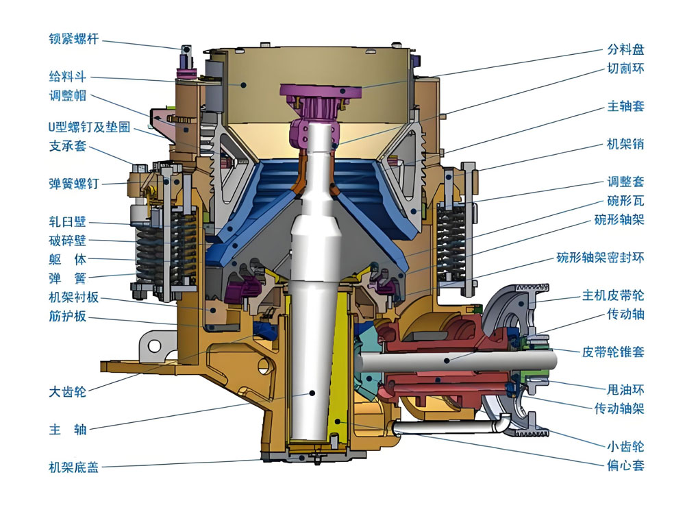 Kerja sama antara kerucut yang bergerak dan liner yang tetap membentuk ruang penghancur progresif, dan material dihancurkan selangkah demi selangkah dari atas ke bawah hingga mencapai ukuran partikel yang ditargetkan. Dalam proses ini, ujung atas poros utama ditopang secara stabil oleh bushing palang, sementara ujung bawah dihubungkan erat ke sistem penggerak hidrolik melalui selongsong eksentrik untuk memastikan stabilitas keluaran daya dan secara efektif menghindari getaran abnormal pada poros utama. Saat material memasuki ruang penghancur, material akan terus-menerus terjepit dan terbentur oleh gerakan berputar eksentrik dari kerucut yang bergerak. Khusus untuk material yang sulit dihancurkan seperti bijih batu keras (seperti bijih besi), CG820i mengadopsi prinsip penghancuran berlapis, dan secara bertahap menghancurkan material hingga ukuran partikel yang dibutuhkan melalui ekstrusi dan benturan terus-menerus. Metode penghancuran ini tidak hanya meningkatkan efisiensi penghancuran, tetapi juga membuat ukuran partikel material yang dihancurkan lebih seragam, memenuhi persyaratan ketat untuk ukuran partikel material di berbagai bidang.