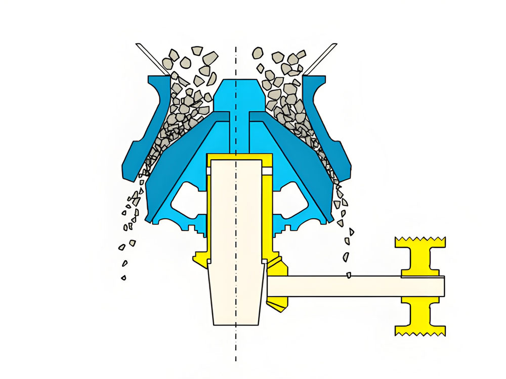 Mengadopsi ruang penghancur kerucut presisi tinggi, yang membentuk area penghancuran progresif antara kerucut bergerak dan kerucut tetap. Kerucut digerakkan oleh busing eksentrik untuk berputar dan berosilasi, dan material dihancurkan secara kasar dengan cara meremas, membelah, dan membengkokkan. Ruang penghancur memiliki pelapis tahan aus bawaan, desain dinding rol yang mengencangkan sendiri mencegah pelapis mengendur dan memperpanjang masa pakai, dan bantalan lengan atas bulat satu bagian menggantikan pelapis tradisional, yang meningkatkan ketahanan aus hingga 5 kali lipat dan memastikan eksentrisitas konstan. Digerakkan oleh motor listrik, daya disalurkan ke selongsong eksentrik melalui poros peredam dan transmisi, menggerakkan kerucut dinamis untuk berputar dengan lintasan tertentu. Kecepatan putar kerucut disesuaikan dengan jarak eksentrik untuk mencapai aksi penghancuran berkelanjutan. Material masuk ke dalam ruang penghancur dari saluran masuk atas, dan ketika kerucut bergerak mendekati kerucut tetap secara berkala, ia menghasilkan ekstrusi intensitas tinggi dan menghancurkan material; ketika kerucut bergerak jauh dari kerucut tetap, material yang dihancurkan jatuh ke bawah dan keluar dari bawah oleh gravitasi. Melalui sistem hidrolik untuk menyesuaikan ketinggian kerucut tetap atau posisi kerucut, untuk mengubah celah keluar ruang penghancur, untuk mengendalikan kisaran ukuran produk jadi. Melalui integrasi mendalam antara desain mekanis dan kontrol cerdas, peralatan ini memecahkan masalah penghancur putar tradisional dalam hal efisiensi, stabilitas, dan biaya perawatan, dan cocok untuk skenario penghancuran bijih kasar skala besar.